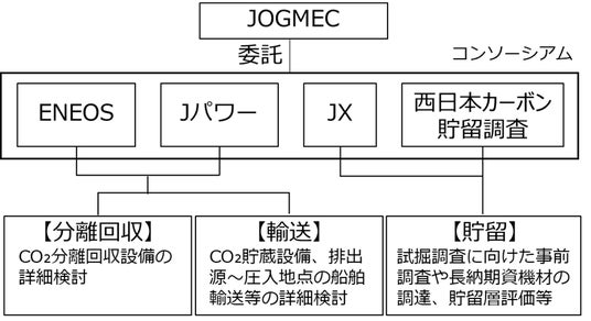 JX石油開発株式会社 ENEOS株式会社 電源開発株式会社 令和 6 年度「先進的 CCS 事業の実施に係る設計作業等」の受託について ~西日本における大規模 CCS バリューチェーンの検討~ JX石油開発株式会社(代表取締役社長 社長執行役員:中原 俊也、以下「JX」)、ENEOS株式 会社(代表取締役社長 社長執行役員:山口 敦治、以下「ENEOS」)、および電源開発株式会社(代表 取締役社長 社長執行役員:菅野 等、以下「Jパワー」)は、西日本カーボン貯留調査株式会社(代表取締役 社長:古舘 恒介)<注 1>と共同で、独立行政法人エネルギー・金属鉱物資源機構(理事長:高原 一郎、以 下「JOGMEC」)より「先進的 CCS<注 2>事業の実施に係る設計作業等」<注 3>(以下「本業務」)を受託し ましたので、お知らせいたします。