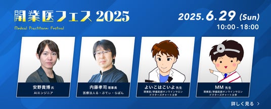 日本最大級の医療機関検索サイトを運営しているカルー株式会社(本社:東京都目黒区、代表取締役:具志 林太郎)とクリニック専門科目に特化した経営コンサルティングを展開している株式会社クレドメディカル(本社:大阪府大阪市淀川区、代表取締役:志賀嘉典)は、開業医けのオンライン展示会『開業医フェス2025』を2025年6月29日(日)に開催いたします。