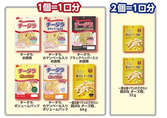 「32g一度は食べていただきたい 贅沢な チーズ鱈(R)」は2個で1口分、その他の6品は1個で1口分として応募できます。