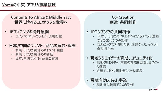 Yorenでは、日本企業が持つ「ものづくりの技術」や「アニメ・マンガといったコンテンツ」を、中東・アフリカ市場で展開することを支援してまいります。当該地域での事業は、以下の2つの柱を軸としています。