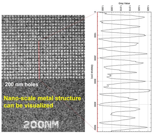 ▲本技術で検査・計測したシリコン上の200ナノスケールのホールパターン