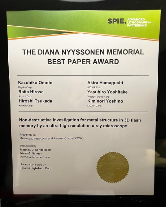 リガク・ホールディングスのグループ会社である株式会社リガク(本社:東京都昭島市 代表取締役社長:川上 潤、以下「リガク」)は、3Dフラッシュメモリ※1の欠陥を非破壊で見つける画期的な手法として、超高分解能X線顕微鏡を用いた検査・計測技術(以下「本技術」)を発表し「The Diana Nyyssonen Memorial Best Paper Award (以下「『本賞』)」を受賞しました。