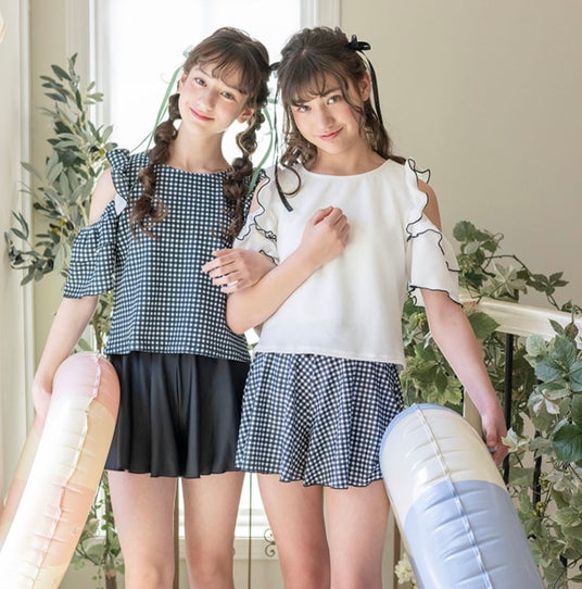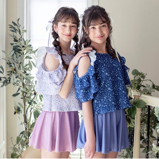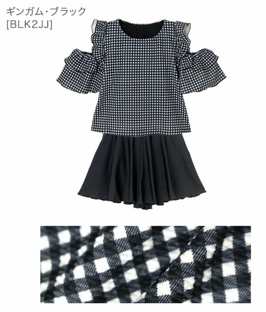 タンクトップの形をベースに肩あきフリル袖をつけた、ちょっぴり大人っぽい表情が魅力のデザイン水着です。ワッフル生地のデザイントップスは、普段着感覚で着られる気安さとかわいらしさを兼ね備えています。水着より抵抗なく気軽に、普段着よりちょっと大胆におしゃれを楽しめるこの水着で、プールやビーチへのお出かけを満喫してください。