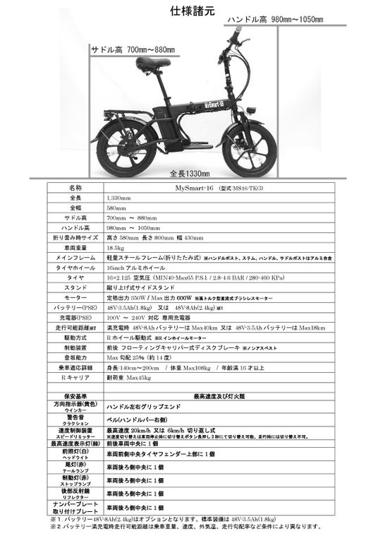 電動モビリティーの開発販売の老舗がプロデュースした車道は勿論歩道や一方通行も走行できる特例特定小型原動機付自転車女性や高齢者でも安定した走行が出来る今までに無かった大径16インチ自転車タイプです。