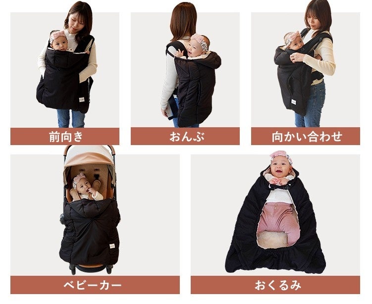 抱っこ紐・おんぶ・前向き抱っこ・ベビーカー・おくるみとしての5WAY仕様を実現し、内側のあったかファー素材・足元ポケット・スマホ収納ポケット・撥水加工など、機能も充実。