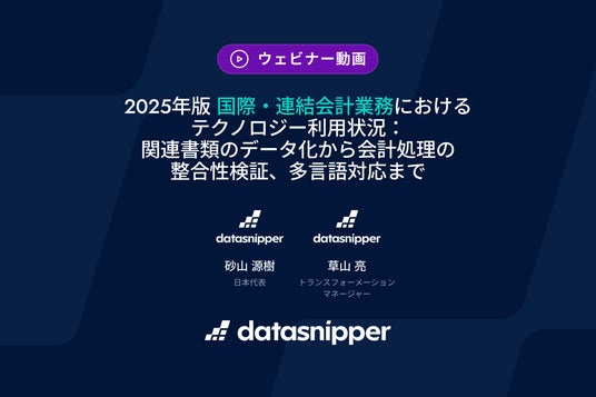 SwiftLink株式会社(本社:東京都中央区、代表取締役:田中 智史)が営業支援を行うDataSnipper B.V.(本社:オランダ、代表取締役:Vidya Peters、以下:DataSnipper )は、2025年11月20日(木)に開催したウェビナー「2025年版 国際・連結会計業務におけるテクノロジー利用状況:関連書類のデータ化から会計処理の整合性検証、多言語対応まで」を、オンデマンド(録画)配信として公開しました。