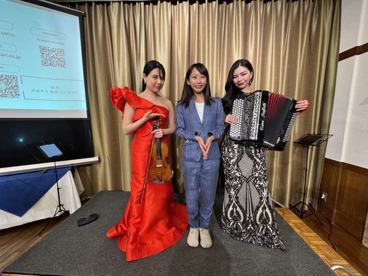 左からヴァイオリニストの寺下真理子氏、宮脇咲、アコーディオン奏者の土屋恵氏