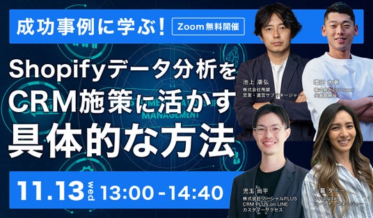 株式会社飛躍(本社東京都港区、代表:明石 健夫 、 Webサイト:https://hiyaku-inc.com/)は、11月13日(水) 13:00~14:40にZoomにて「成功事例に学ぶ Shopifyでデータ分析をCRM施策に活かす具体的な方法」セミナーを開催いたします。