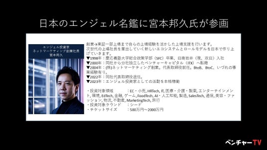 株式会社ベクトル(本社:東京都港区、代表取締役会長兼社長CEO:西江 肇司、東証プライム:6058、以下ベクトル)は、スタートアップ企業のプレゼン動画を視聴できる動画型メディア「ベンチャーTV」内の「投資家名鑑」に、エンジェル投資家として、ネットマーケティング創業者であり、エンジェル投資家として活動されている宮本 邦久氏が新たに参画したことをお知らせします。