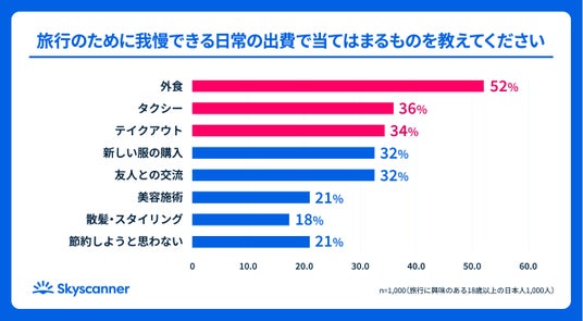 旅行資金のためなら「外食(52.3%)」や「タクシー(36.2%)」を我慢すると回答。日常のプチ贅沢を削り、旅に一点投資する堅実な傾向が見られます。