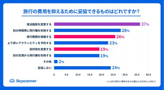 費用を抑えるための妥協点については、「宿泊施設を変更する」が37%と最多となりました。一方で、「旅行期間を短縮する」 が26%であることや「目的地を変更する」 が19%と比較的少なく、「行きたい場所へ行き、十分な時間を過ごす」という体験の核を守るために、ホテルのランクなどは柔軟に調整するという、メリハリの効いた判断が行われていることがわかります。