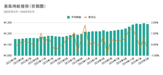 2025年3月までの3年間で、首都圏の募集時給は1,151円から+136円(+11.82%)上昇し、1,287円となっています。なお、2024年3月から2025年1月までの1年間では、+57円(+4.63%)の増加となりました。