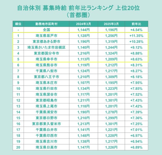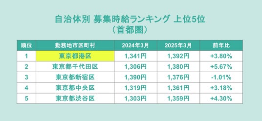 続いて、2025年3月時点の募集時給を前年比のランキングで分析し、時給上昇率に勢いのある首都圏エリアの自治体を調査しました。