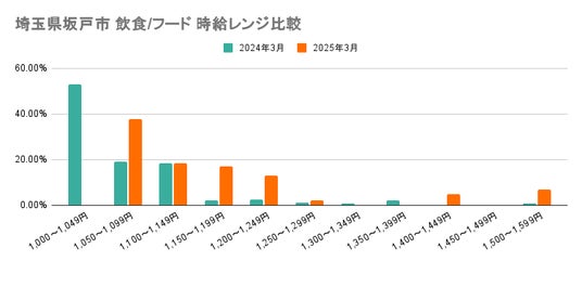 最後に、坂戸市において「飲食/フード」職種の募集時給を価格帯ごとの求人数で調査し、2024年3月と2025年3月でそれぞれの全体に占める割合を比較します。1年間でボリュームゾーンの変化を見てみると、最低賃金が1,028円から1,078円に引き上げられたことで「1,000~1,049円」の出稿が0件に減り、「1,050~1,099円」と「1,150~1,249円」の割合が増加しました。