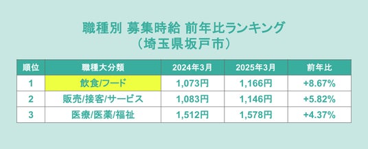 さらに、坂戸市における募集時給の前年比を職種別に比較したところ、「飲食/フード」が+8.67%で1位となりました。次いで「販売/接客/サービス」が+5.82%、「医療/医薬/福祉」が+4.37%と続いています。