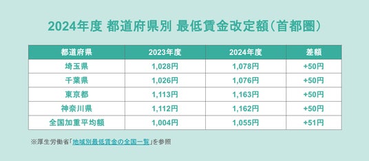 首都圏エリアでの最低賃金引き上げ額を都道府県別に見てみると、元々の賃金水準が高いことから、全ての都県で全国加重平均を1円下回る50円の引き上げとなっていました。