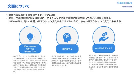 - 今日から使える即効性のあるノウハウを提供ターゲットリスト作成、プロフィール設計、メッセージ作成など、具体的な営業プロセスをステップごとに解説。資料を基に営業活動を効率化し、今日からの営業活動に反映できます。