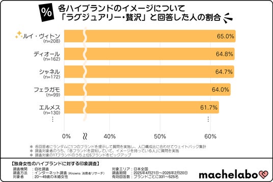上位5ブランドの結果を見ると、『ルイ・ヴィトン』が65.0%で最も高い割合となりました。次いでわずかな差で『ディオール』が64.8%、『シャネル』が64.7%、『フェラガモ』が64.0%となり、これに『エルメス』が61.7%と続きます。
