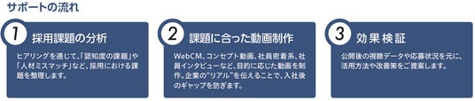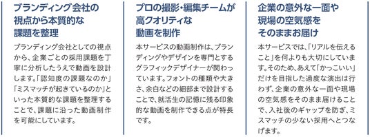 動画は企業の知名度を高めることはもちろん、文章や静止画では伝えきれない職場の雰囲気や人柄、価値観を直感的に伝えることで、学生は「自分がそこで働く姿」を具体的にイメージしやすくなるという特長があります。