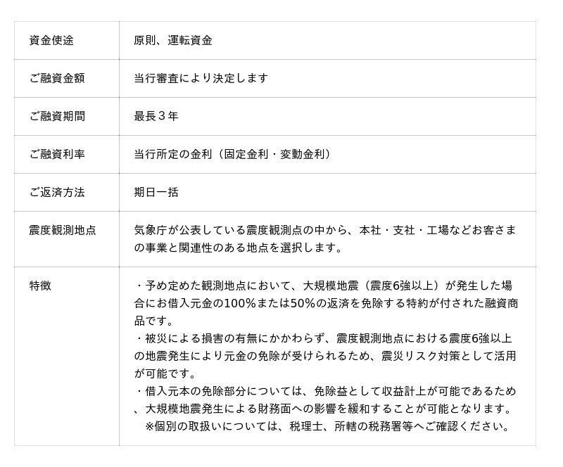 中国銀行(岡山市 頭取 加藤 貞則)は、ケイ エス エス有限会社に対し、『震災時元本免除特約付き融資(※)』を実行しましたのでお知らせします。