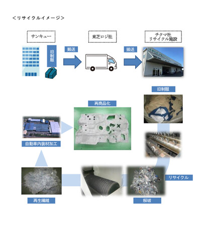 株式会社エディオンの子会社である株式会社サンキュー(以下、「サンキュー」)の営業店舗(100満ボルト)で採用していた制服を、自動車内装材としてリサイクルしました。2022年10月からエディオンと制服デザインの統一を行ったことに伴い実施したものです。リサイクルにあたっては、チクマ社の持つリサイクルノウハウを活用しました。再資源化を行うことで、廃棄物の削減に加え、廃棄段階でのCO2排出も抑制できるため、環境負荷低減とともにSDGsの達成にも寄与することができました。この取り組みによるCO2の排出削減量は、約691Kgとなります。また、サンキューの拠点から北九州市にあるチクマ社のリサイクル施設まで運ぶ方法についても、東芝ロジ社による定期配送ルートを活用することで、新たなCO2を排出することなく実現しました。当社は「お客様の豊かな暮らしを永続的に支える企業」でありたいと考え、企業活動にとどまらず環境保全や社会貢献も軸にサステナビリティ経営を推進しています。地球環境と調和した持続可能な社会を実現することは企業の責務であると捉えており、環境負荷低減を重要な課題の一つとして認識し、自然環境の保全とともに循環型社会や脱炭素社会の実現に向けて取り組むことで、豊かで潤いのある社会環境の創造を目指しています。今後も環境に配慮した取り組みを通じて、資源循環や持続可能な社会の実現に貢献してまいります。<リサイクルイメージ>