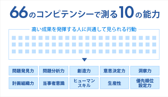 受験者1名様の回答につき、3名の専門スタッフで客観的かつ精密に採点する “スコアリング” を行います。スコアリングでは、当社独自に開発した「66のベーシックコンピテンシー」を評価基準にし、回答から判断や行動を表す“プロセス”部分を抜き出し、管理職に必要な10のマネジメント能力を測定し数値化します。