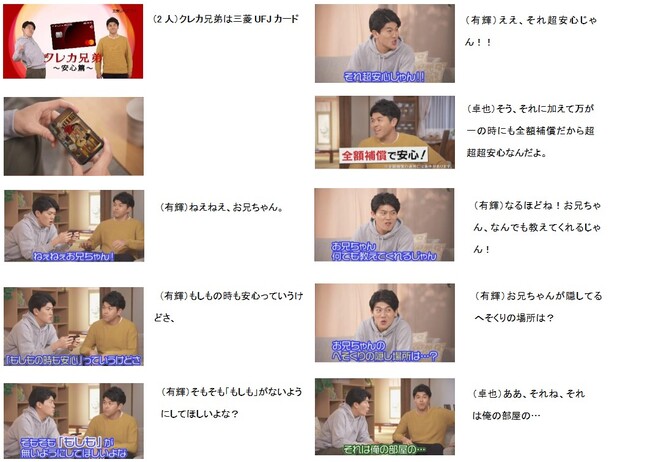 今回の動画は安心篇とおトク篇の2本立て。三菱UFJカードのWebCMをリビングのソファで見ていた弟の有輝に兄の卓也が三菱UFJカードの安心感やおトク感を熱弁します。土佐家をのぞき見しているかのようなリアルな2人の会話に注目してください。