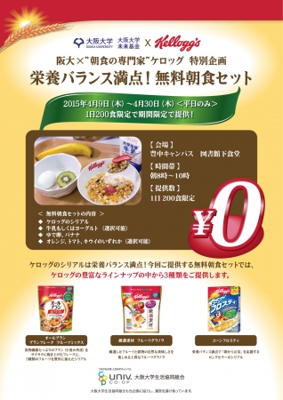 このプロジェクトは、新年度の講義開始日にあわせ、「新入学生に朝食を取る習慣を身に付けて、健康で規則正しい学生生活を送ってもらいたい」という目的で、大阪大学未来基金の学生支援事業の一環として、ケロッグ社の全面的な協力により実施します。無料朝食セットの提供は、学食を運営する阪大生協が担当します。