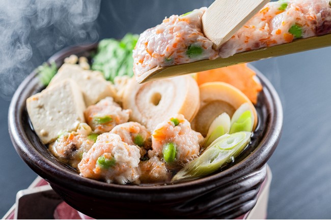 バイキングコーナーよりお好きな鍋具材を選んでいただき、お席で小鍋にてお召し上がりいただけます。寒ぶりのつみれは専用の竹筒に入っており、ご自身で小鍋に。寒ぶりつみれの出来立ての風味をお楽しみいただけます。