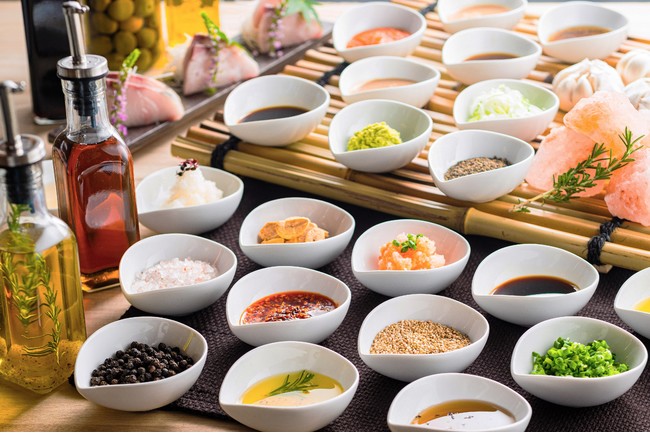 ソース5種類(醤油、ポン酢、オリーブオイル、ごま油、レモン汁)、トッピング6種類(ガーリックチップ、大根おろし、青ネギ、ブラックペッパー、岩塩、わさび)を組み合わせて、100種以上の中から自分好みの創作タレを見つけていただけます。