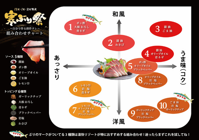 この度湯快リゾートでは、「寒ぶり祭」で提供する創作タレのおすすめの組み合わせをご紹介するタレマップを作成しました。和風と洋風、あっさりとコクなどタレの候補が豊富にあるので、老若男女問わず幅広い年代の方にお楽しみいただけます。