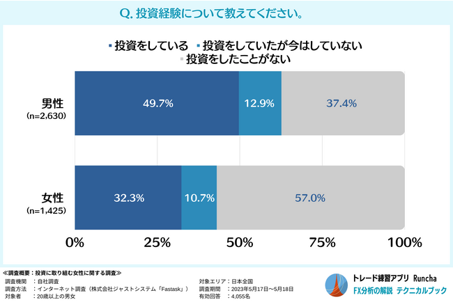 実際に投資に取り組んでいるか質問したところ、「投資をしている」と回答した人の割合は、男性が49.7%であるのに対し、女性は32.3%と低い割合となりました。