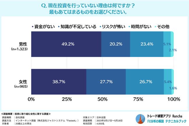 結果を男女別に集計すると、男性の1位は「資金がない」の49.2%、2位が「リスクが怖い」の23.4%、3位が「知識が不足している」の20.2%となっています。一方で女性の1位は「資金がない」の38.7%、2位は「知識が不足している」の27.7%、3位は「リスクが怖い」の26.7%でした。