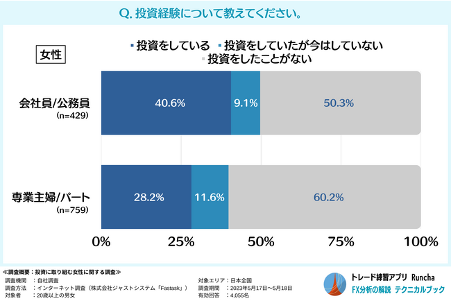 テクニカル分析専門サイト『テクニカルブック』は、投資に取り組む女性について調査する目的で、20歳以上の男女4,055名を対象にアンケートを行いました。本調査からは、女性の投資に対して消極的な姿勢とその理由が見えてきました。