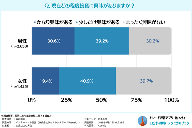投資に対する興味について質問したところ、「かなり興味がある」と回答した男性が30.6%で、女性は19.4%でした。また、「まったく興味がない」と回答した男性は30.2%で、女性は39.7%でした。