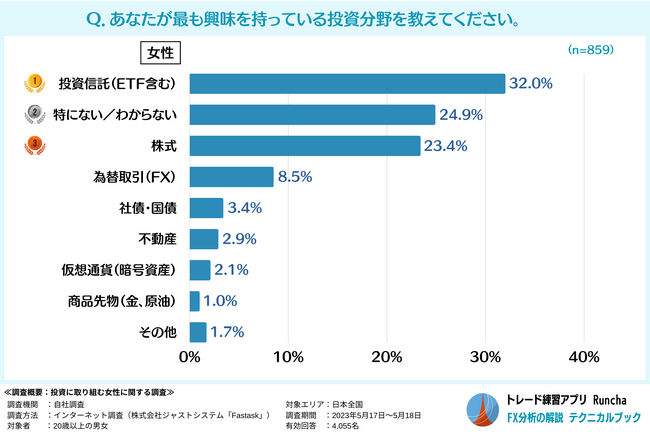 一方で女性の1位は「投資信託(ETF含む)」の32.0%、2位は「特にない/わからない」の24.9%、3位は「株式」の23.4%でした。4位は「為替取引(FX)」の8.5%で、3位と大きく差が開いています。男性と比較すると、女性は株式よりも投資信託に対する興味が強い傾向があることが読み取れます。