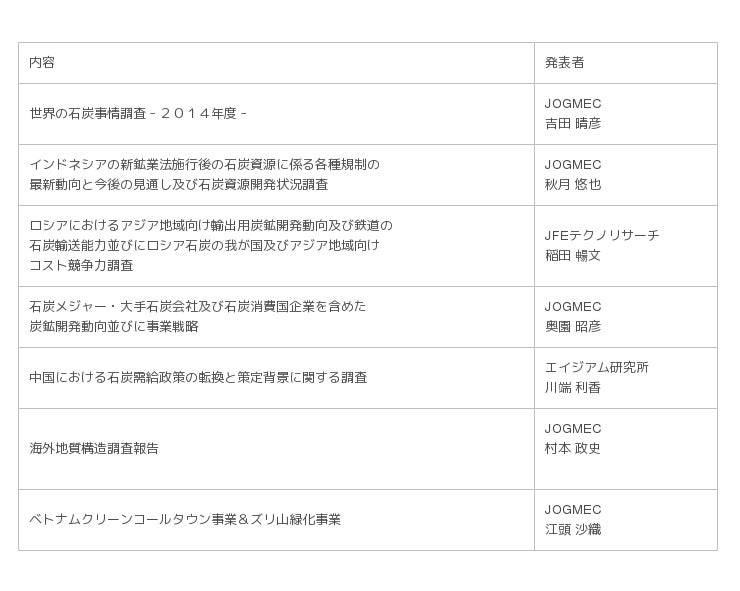 調査テーマについては、石炭業界のニーズを把握した上で、最新の石炭事業動向を踏まえ、平成26年3月に先行して3件の報告をしております。今回の報告会では、JOGMECが毎年産炭国・消費国の動勢を注視しております「世界の石炭事情調査-2014年度-」を含む海外炭開発高度化等調査5テーマに加え、海外地質構造調査およびJV調査、ベトナムクリーンコールタウン事業およびベトナムズリ山緑化事業の成果を発表いたしました。