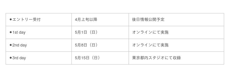 ※2nd day、3rd dayは、それぞれその前の日程で勝ち残った方のみの出場となります。通過人数などの詳細は後日発表予定です