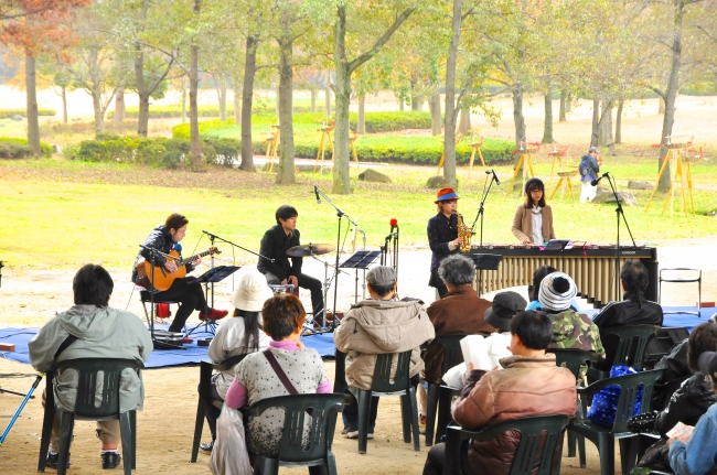 パフォーマンスの舞台は、東京ドーム11個分(50.5ヘクタール)の広さに、森・水辺・田園の自然風景が広がる癒しの公園「21世紀の森と広場」で定期的に開催される「ドコでもシアター」。