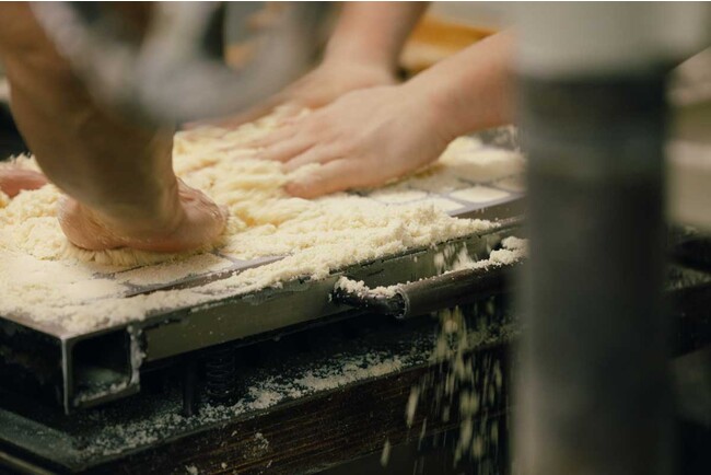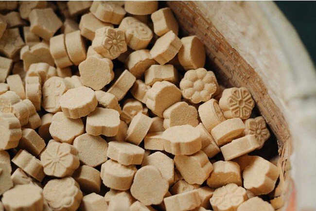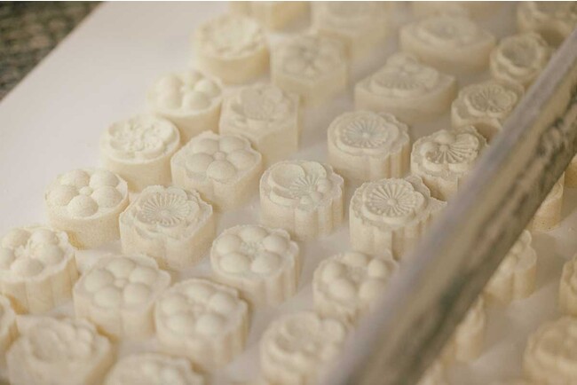 落雁とは、お米や麦、豆などの穀類をすり潰した粉に水飴や砂糖を混ぜ、型に押し固めて乾燥させた干菓子で、非常に硬いイメージですが、日親製菓は「親しみやすい和菓子」を目指し、口溶けのいい柔らかさを追求した、「硬くない落雁『ソフト落雁』」で専業化。独特のやわらかさに加え、原材料に油脂を一切使用せず、本来の自然の味と香りを大切にしています。