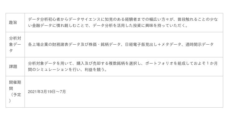 AlpacaJapan株式会社(以下「Alpaca」)は、株式会社日本取引所グループ(以下「JPX」)が立ち上げたITやデータ分析を活用した取引の学習環境の提供に係る実証実験プロジェクト「J-Quants」に2021年1月よりITサポートベンダーとして技術サポートを提供しており、本日よりデータ分析コンペティションの第2弾(以下、「本コンペティション」という。)が開始されます。