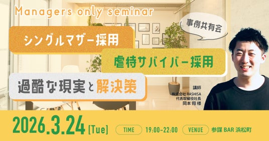 株式会社経営参謀(本社:東京都新宿区、代表取締役:新谷 健司)は、自社が運営する経営者コミュニティ「参謀」の特別企画として、2026年3月24日(火)に「参謀BAR 浜松町」にて経営者向けの事例共有会を開催いたします。 本イベントでは、株式会社RASHISA 代表取締役社長の岡本翔氏を講師に招き、シングルマザーや虐待サバイバーをスタッフとして雇用したインサイドセールス事業において直面した生々しいトラブルと、それを乗り越え経済合理性のある組織体制を構築した独自のノウハウを公開します。