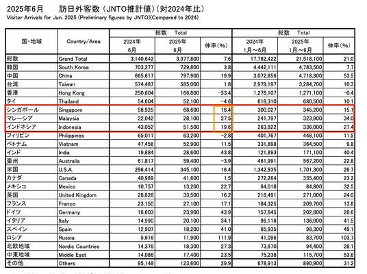 近年、マレーシア、インドネシア、シンガポールなど、ムスリム人口の多い東南アジア諸国からの訪日旅行者が急増しています。JNTO(日本政府観光局)の発表によると、2025年6月の訪日外国人客数は単月で3,377,800人に達し、年累計は過去最速で2,000万人を突破しました。
