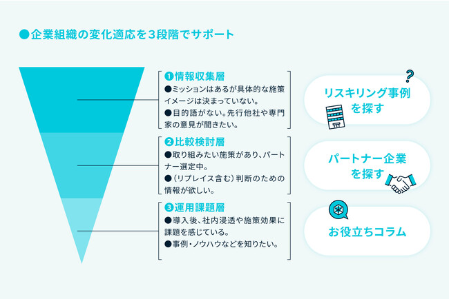 ただ学習サービスを導入すれば良いわけではなく、経営戦略と連動した必要人材の定義や育成プロセスへの落とし込み、報酬設計を伴う制度構築などが必要です。一方で、国内の成功事例はまだ少なく、人材育成担当者は情報収集・施策検討・運用フェーズでそれぞれ専門的なサポートを必要としています。