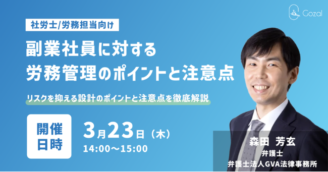 クラウド型給与計算チェックソフト「Gozal(ゴザル)」を運営する株式会社Gozal(本社:東京都目黒区、代表取締役:高谷 元悠)は、「副業社員に対する労務管理のポイントと注意点」について2023年3月23日(木)14時~弁護士法人GVA法律事務所(東京都渋谷区、代表弁護士: 山本 俊)とオンラインウェビナーを共催いたします。