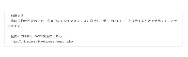 日本経済新聞社が運営するシェアオフィスマッチングプラットフォーム(https://officepass.nikkei.jp)。全国250カ所以上のシェアオフィスやコワーキングスペースの自由席が予約なしで利用できます。外出時や在宅勤務時のワークスペースとして活用いただくことで、生産性の向上に貢献します。OFFICE PASSは誰もが本来の力を発揮できる場所で働ける社会の実現を目指しています。