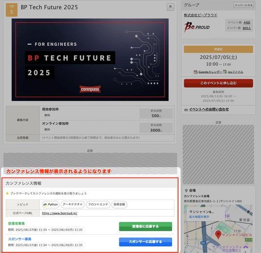 イベント詳細ページにも 「カンファレンス情報」 欄が追加され、募集のステータスや締切がひと目で確認可能に。関心を持ったユーザーが迷わず応募に進める設計となっています。