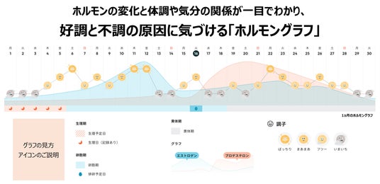 iOS版に続きAndroid版を公開した生理管理アプリ『ソフィBe』は、従来の生理日管理はもとより、「ホルモンと体調」の変化に着目し、さらに女性の心身によりそうことを目標としています。最大の特長である「ホルモングラフ」では、ホルモンの変化と体調や気分の関係をグラフで可視化し、好不調の原因をつかみやすくすることで、女性が体調と向き合うことをサポートします。