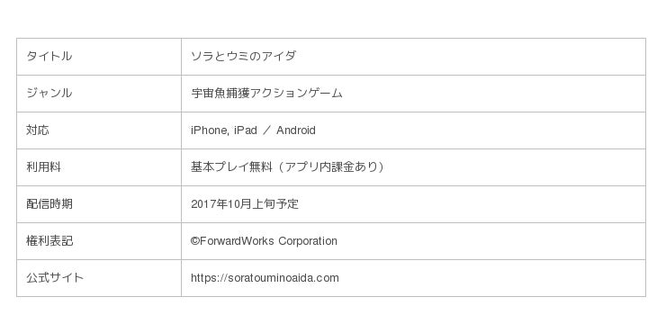 株式会社フォワードワークス(以下FW)は、2017年10月上旬より配信予定のスマートフォン向けゲーム『ソラとウミのアイダ(以下ソラウミ)』の魅力を紹介するラジオ番組、『宇宙漁師候補生がラジオやってみた!宇宙漁業団非公認!花林とほの花とももことソラとウミのラジオ!略してギョギョッとラジオ!さらに略してギョギョラジ!(以下ギョギョラジ!)』を、文化放送インターネットラジオステーション「超!A&G+」にて、2017年9月3日(日)13:00より放送を開始いたします。 また、同内容はインターネットラジオステーション<音泉>にて、2017年9月4日(月)から一週間配信いたします。