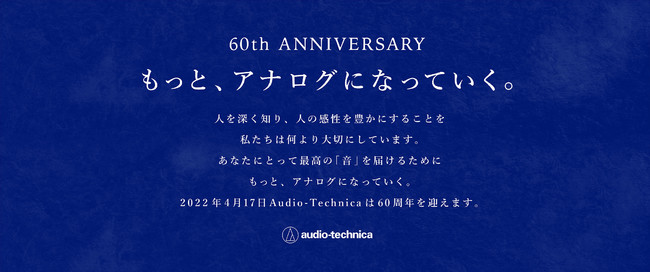 株式会社オーディオテクニカ(本社:東京都町田市 代表取締役社長:松下和雄)は、2022年4月17日に創業60周年を迎えます。これまで支えてくださった世界中の皆様に心より感謝するとともに、この60周年を機に、新たな企業ブランドメッセージ「もっと、アナログになっていく。」を発表し、一年を通して様々な取り組みを展開して参ります。